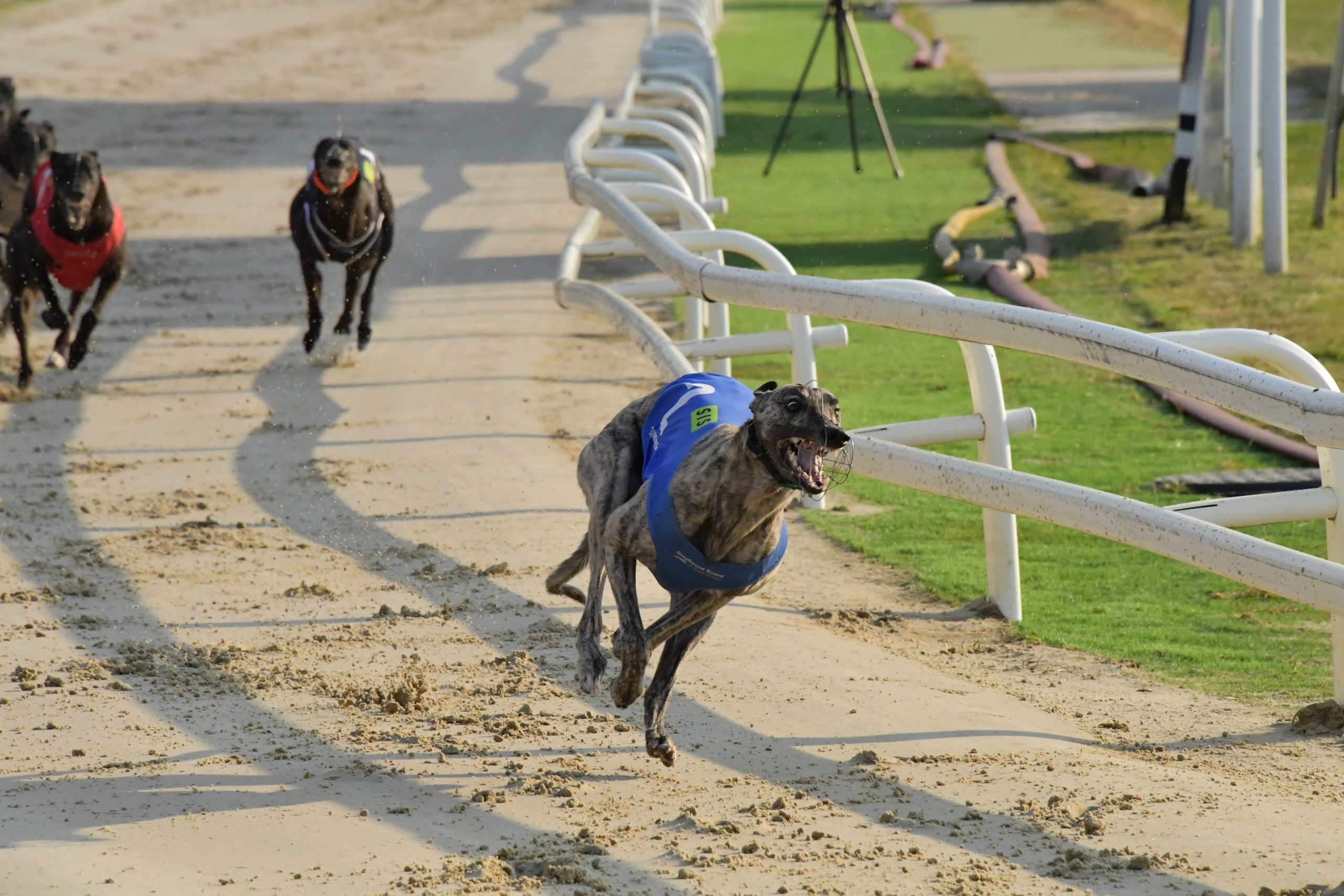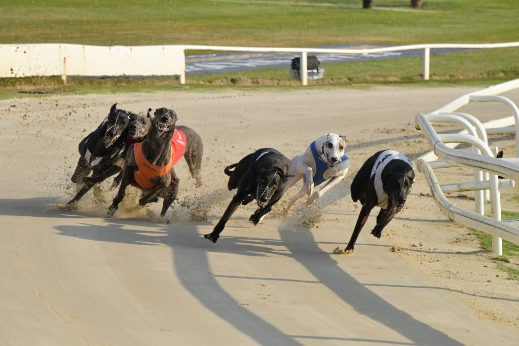Brinkleys Magic (White Jacket) hugs the rail before going on to win Heat 2 by 7 1/2 lengths from Clona Duke (black jacket). Beepers Lariat (1) can find no daylight between Untold Zloty (6) and Jet Stream Wind (5).