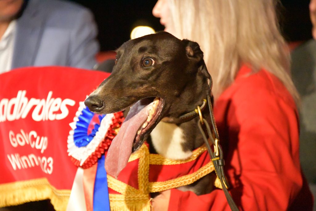 Links Maverick enjoys the attention after winning the Ladbrokes Gold Cup at Monmore in August 2023 Photo: Paul Blake