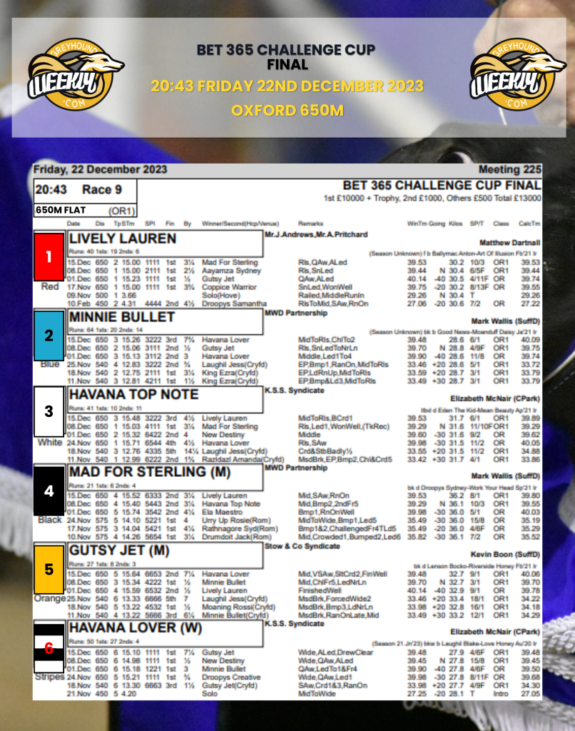 Havana Lover (pictured above in 6), is currently in a fantastic steak of form. She has won 7 from her last 9 appearances, and is definitely another bitch who heads into this final in brilliant form.