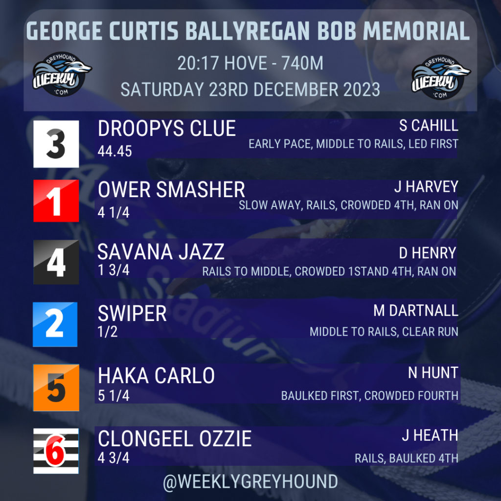Droopys Clue may well have etched his name on to the greyhound of the year trophy with his third Category 1 final win of 2023 in the George Curtis Ballyregan Bob Memorial at Hove earlier this evening.