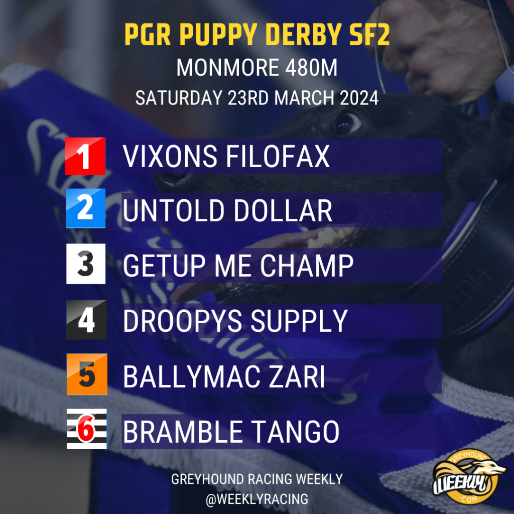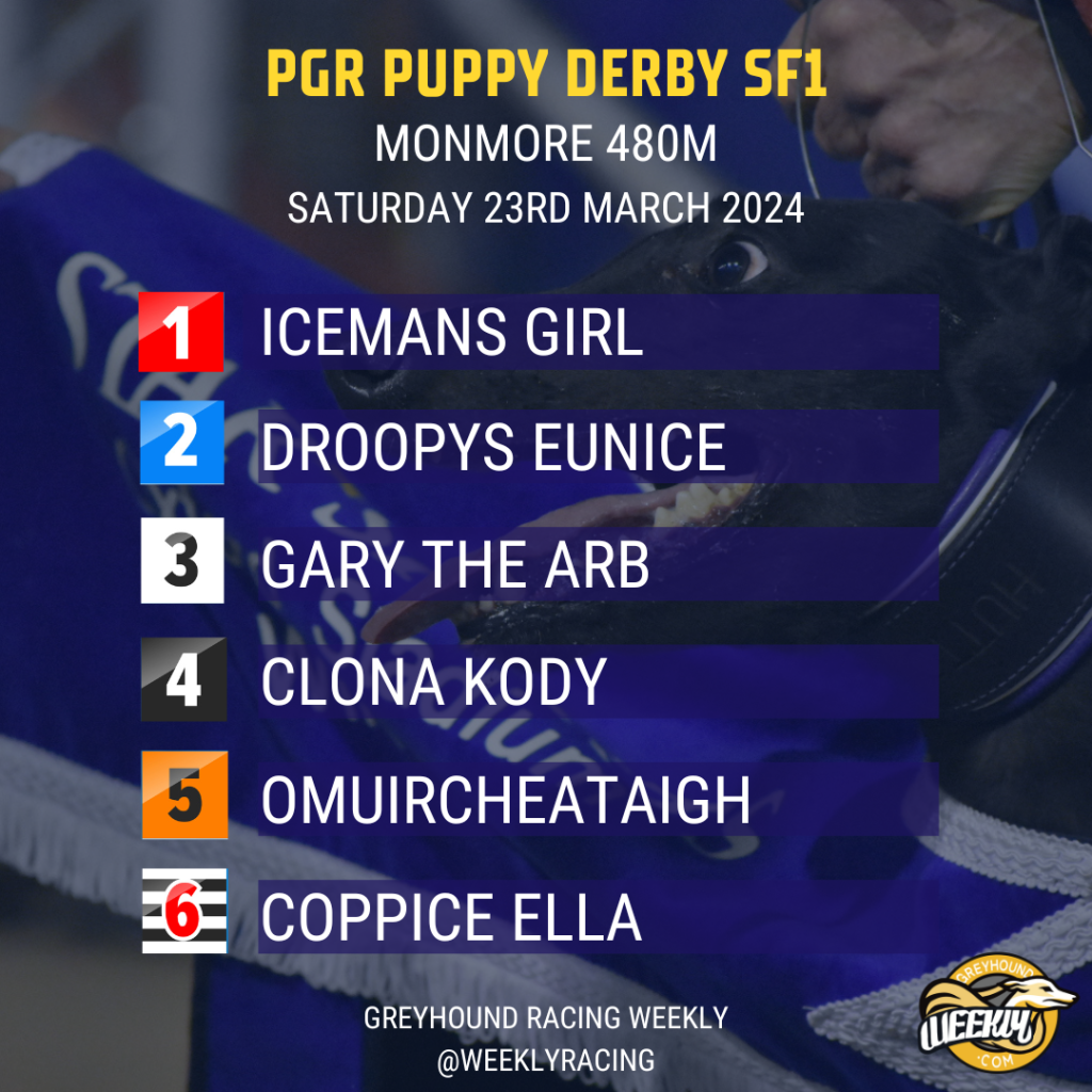 Omuircheartaigh runs from trap five once more in the first of three semi-finals next weekend. Vixons Filofax, who tends to prefer trap three or four, faces a tough job from trap one in the second semi while Clona Curly has trap five in semi-final three.