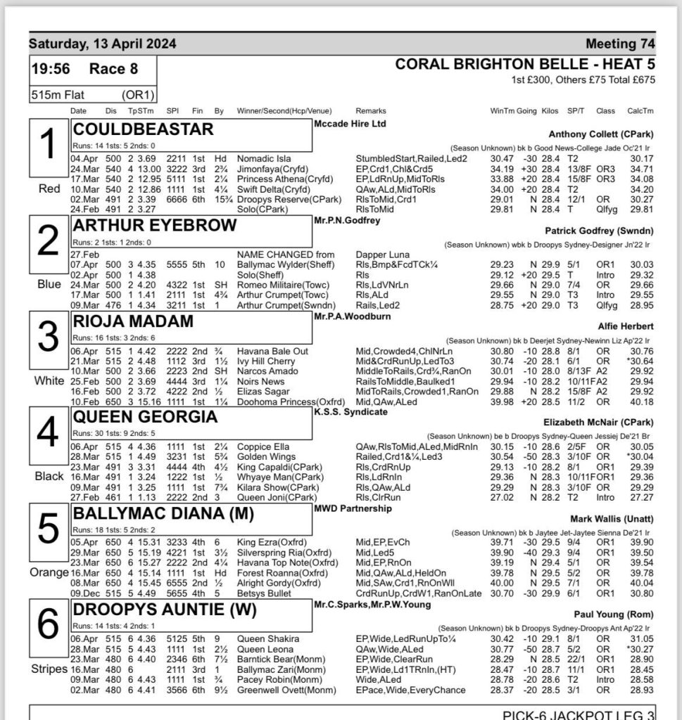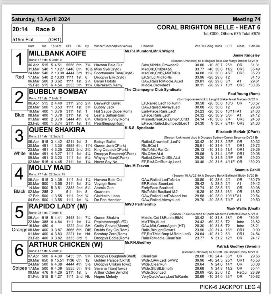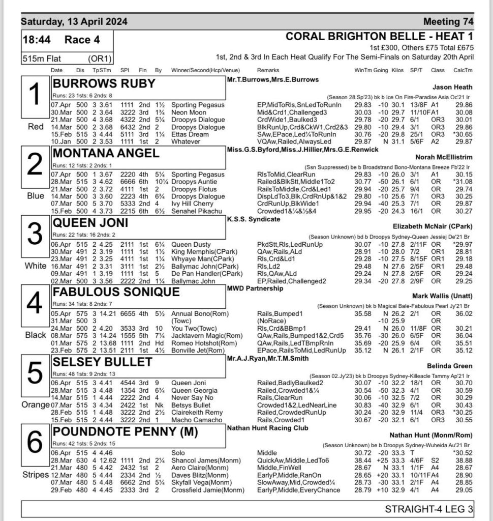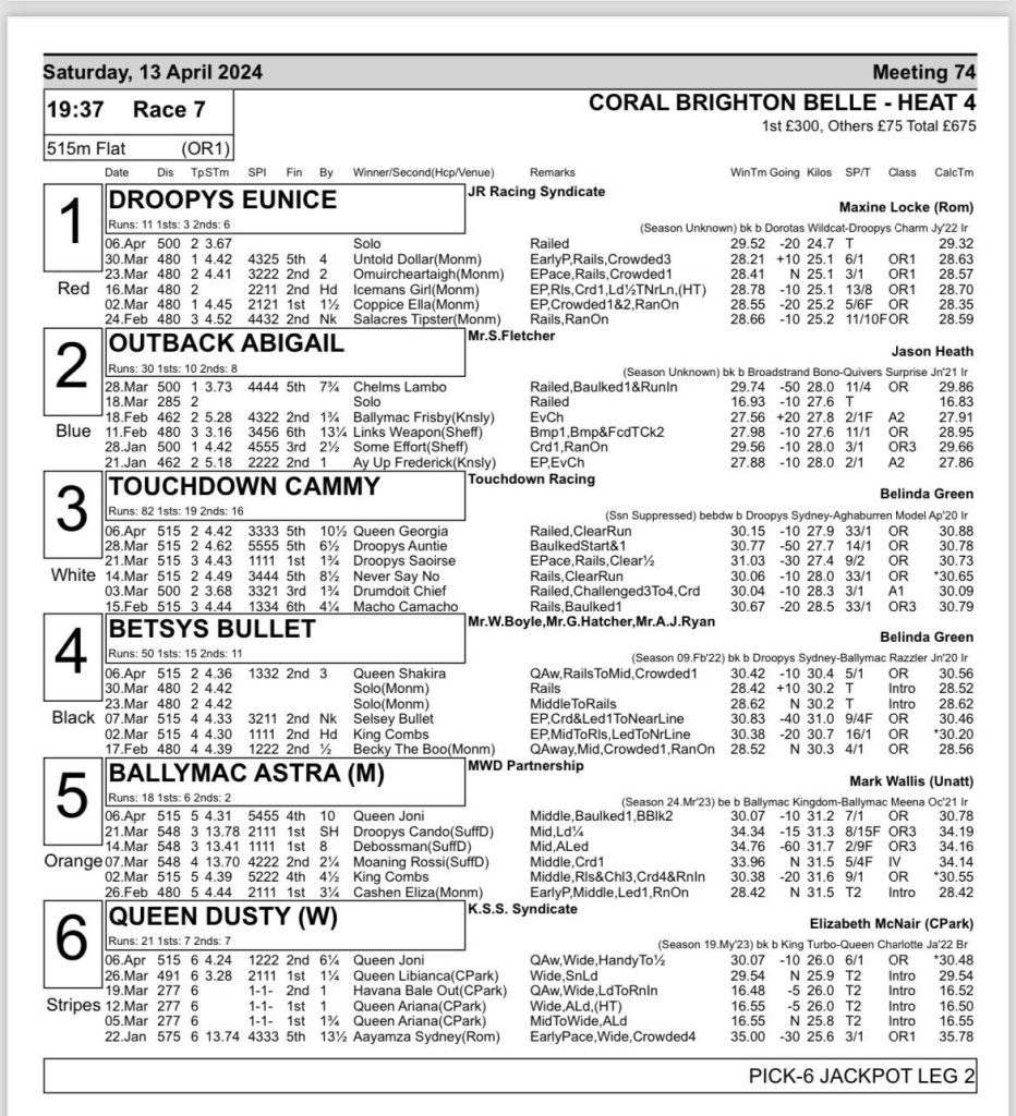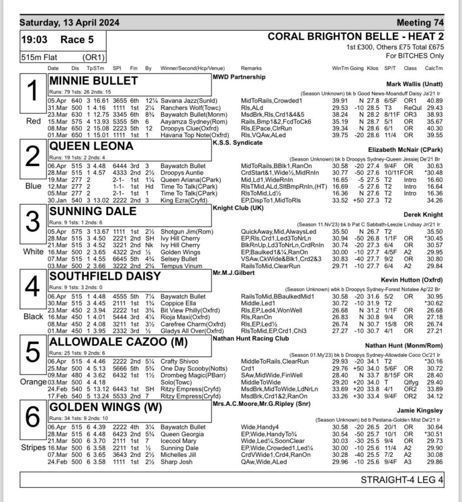 A well supported competition that boasts some of the top class ladies currently in the sport including the reining Brighton Belle 2023 winner Betsys Bullet ( trained by Belinda Green & owed by Mr W Boyle, Mr G Hatcher & Mr A Ryan).