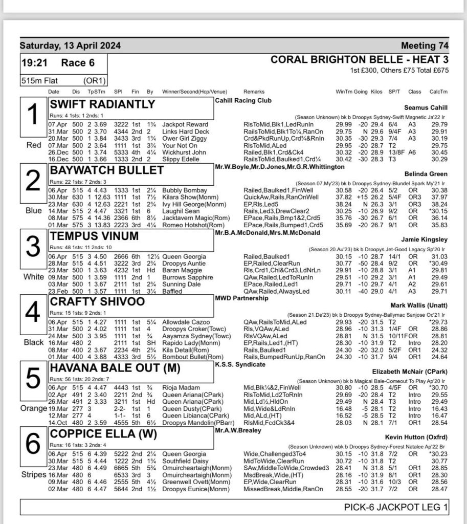 Another market leader here in the form of Crafty Shivoo for Mark Wallis. Just coming right out of her season, clocking a 29.73(-20) in her recent trial. She will be looking to dominate early and get the rail pitch. She will need to clear Havana Bale Out for Liz McNair, winner of the 2023 Coral Sussex Cup Consolation back here in July 2023 winning in an impressive 29.59.(+10). Coppice Ella for Kevin Hutton has a decent make up on the outside. The youngster comes to Hove following her time running through the Monmore Puppy Derby .