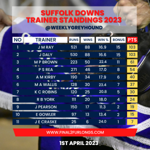 Jim Daly and Jason Ray neck and neck at the top of the Suffolk Downs @WeeklyGreyhound graded trainer standings